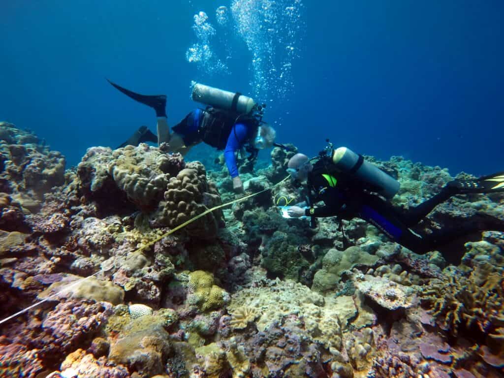 Support marine research by collecting data on coral reef health and fish biodiversity in areas with varying shark populations.